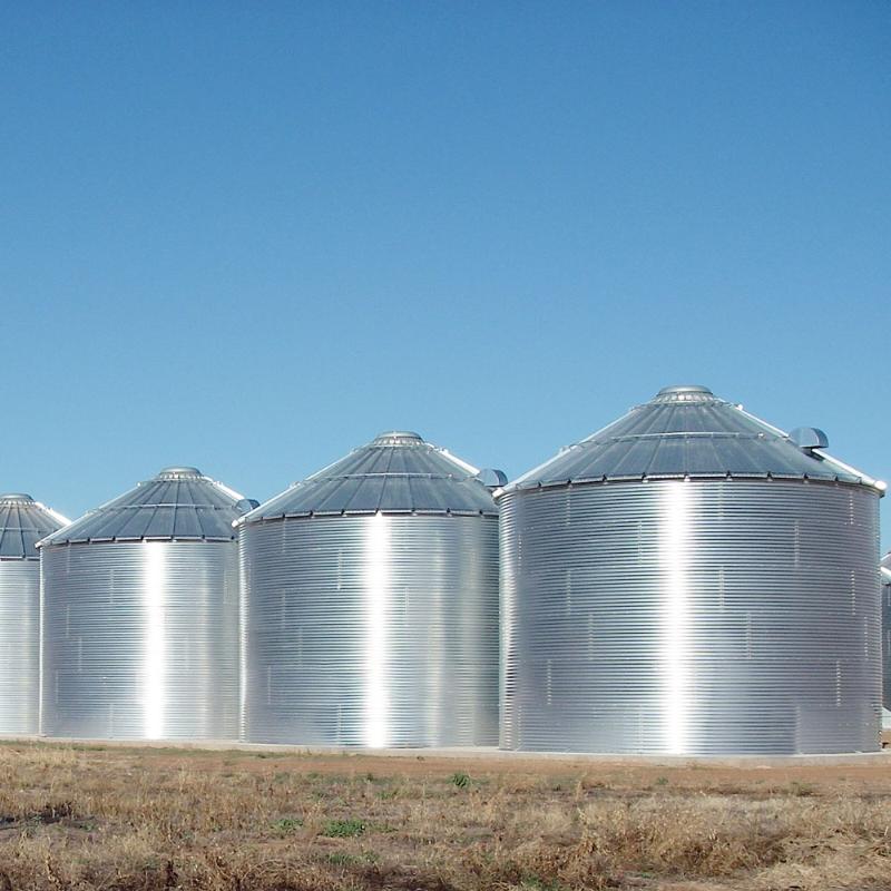 机械辊压和模压成波纹型的板材冲孔,通过高强度螺栓连接装配。商用平底钢板仓适用于大容量安全仓储。